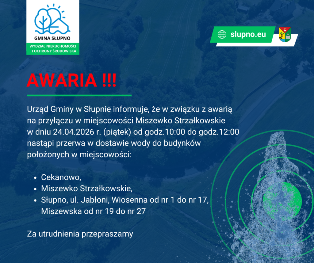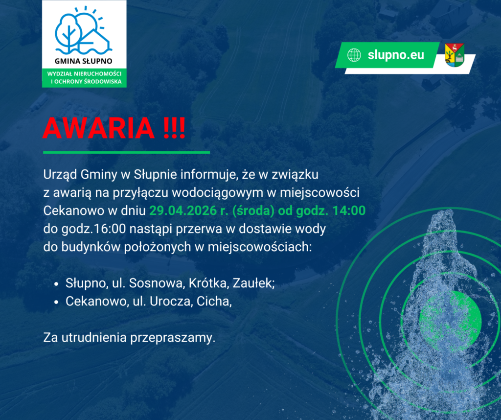 Gmina Słupno informuje, że w związku z trwającą wymianą wodomierzy Konserwatorzy realizujący zadanie będą się z Państwem kontaktować telefonicznie w celu uzgodnienia godziny wymiany urządzenia. Bardzo prosimy o współpracę.